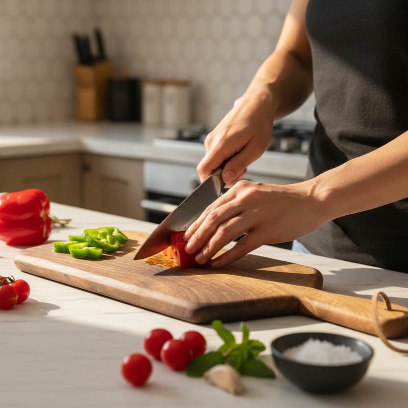 Sturdy walnut cutting board, naturally antibacterial.
