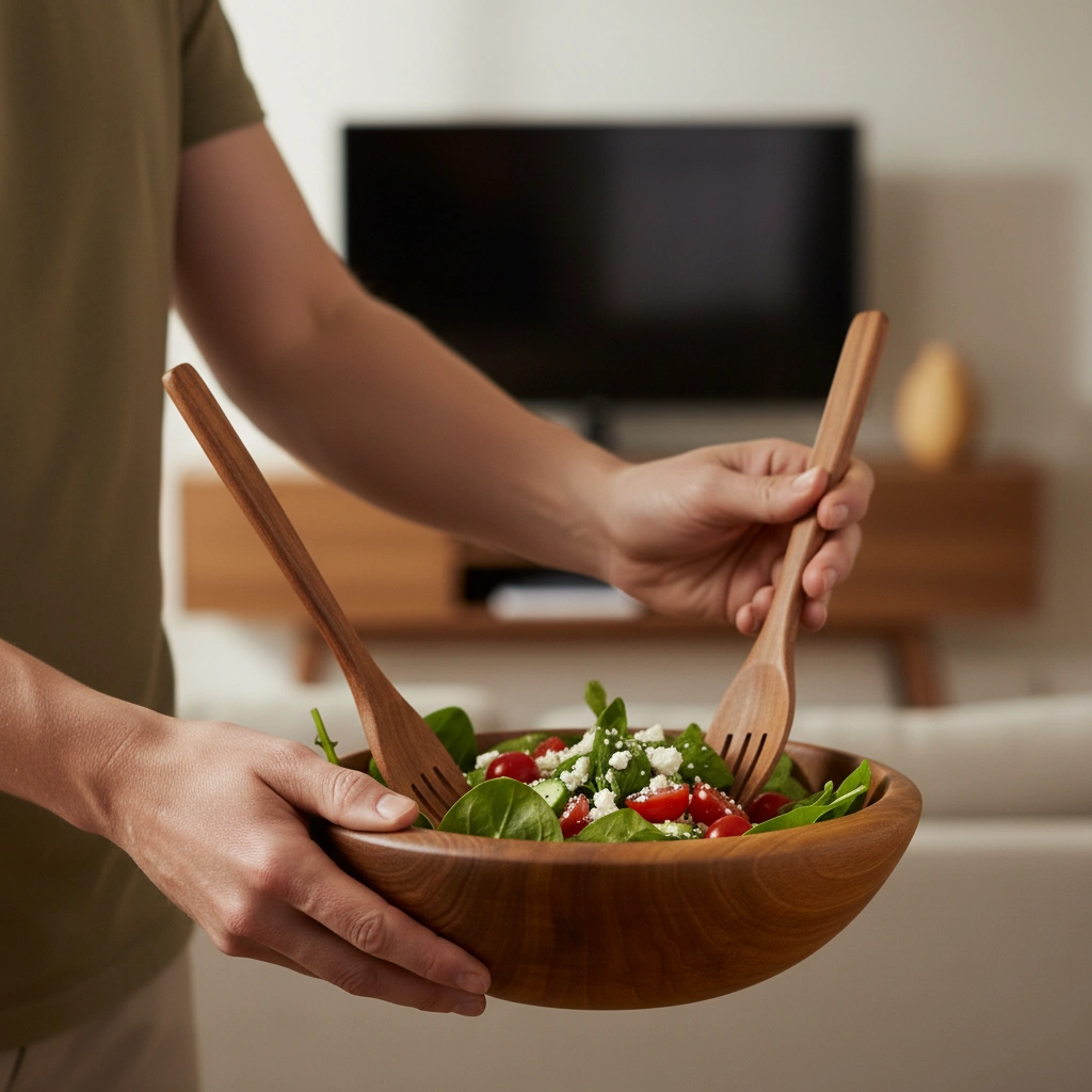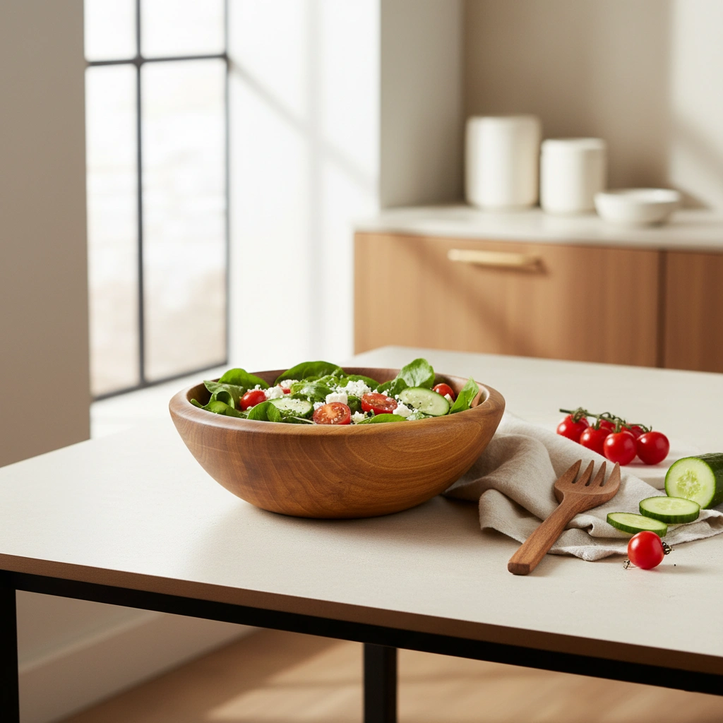 Handcrafted walnut salad bowl, solid and elegant. Natural finish that adds warmth to your table.